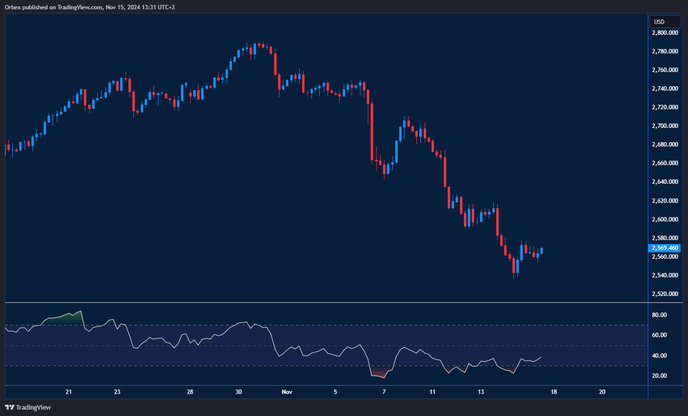 الذهب يبحث عن الدعم، حيث تراجع إلى ما دون مستوى 2550 ليسجل قاعًا جديدًا عند 2535. أدى الانخفاض تحت 2600 إلى خروج المشترين من مراكزهم، مما منح البائعين فرصة لاختبار منطقة 2500. يعتبر المستوى الجديد عند 2535 دعمًا أساسيًا لمنع استمرار الاتجاه الهبوطي. على المدى القريب، يشير التباعد الإيجابي على مؤشر القوة النسبية إلى احتمال تباطؤ في الزخم الهبوطي. هذا الأمر قد يدفع إلى ارتداد في حال قرر البائعون خلال اليوم جني الأرباح.