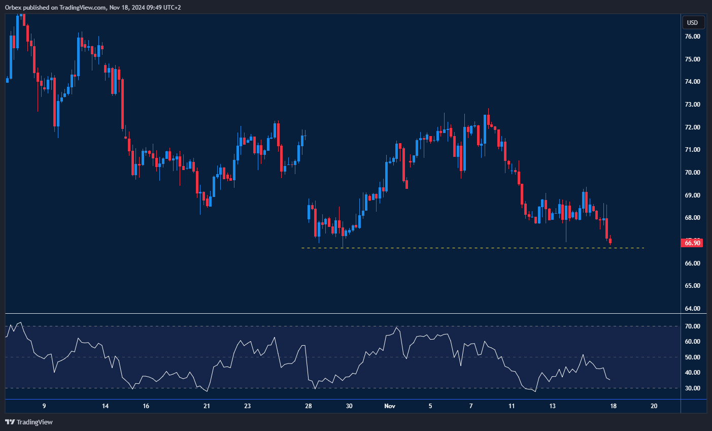 انخفض النفط الخام إلى أدنى مستوى جديد ليختبر منطقة الأسعار التي شهدها في أكتوبر عند 66.80. يظهر الرسم البياني أن السعر دخل في مرحلة تصحيح بعد تراجع كبير أدى إلى خسارة أكثر من 4 دولارات خلال الجلسات الأخيرة. ورغم أن النظرة العامة على المدى المتوسط لا تزال إيجابية، فإن مستوى 68.00، الذي تحول من دعم سابق إلى مقاومة حالية، يمثل عائقًا رئيسيًا أمام أي ارتداد، مما يُطيل من أمد التصحيح. يُعد مستوى 65.50 نقطة دعم حاسمة يجب الحفاظ عليها. حيث إن كسر هذا المستوى قد يؤدي إلى موجة بيع إضافية تدفع السعر نحو مستوى 60.00. أما على الجانب الصعودي، فإن تجاوز مستوى 69.20 سيكون إشارة لتخفيف الضغط وإعادة الزخم الإيجابي.