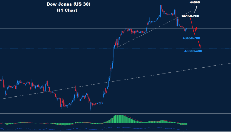 تمكن مؤشر داو جونز من الهبوط إلى ما دون مستوى الدعم 44150 أمس، إذ نصحنا من قبل بأن المزيد من الهبوط قد يضرب السوق تحت هذا المستوى