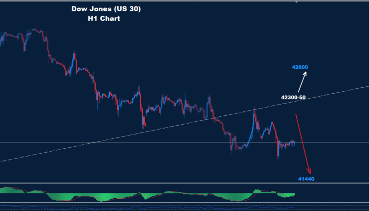 تمكن مؤشر داو جونز من تجاوز مستوى 42050 الأسبوع الماضي حيث تمكن من اختبار منطقة المقاومة الثانية 50-42300 قبل أن يواصل السوق موجة الهبوط