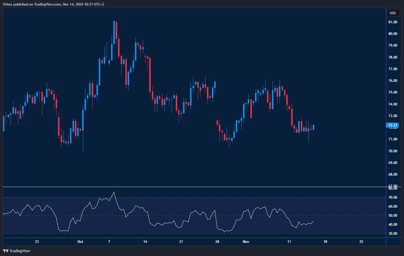 ثبات أسعار النفط بعد الانخفاض الأخير الذي شهد فقدان أكثر من 10 دولارات من قيمته في الشهر الماضي. إذ أثرت قوة الدولار الأمريكي والآمال بحلول السلام في الشرق الأوسط على الأسعار بشكلٍ عام. إضافةً إلى التأثير المحتمل لرئاسة ترامب التي قد تتسبب في مزيدٍ من الانخفاض في الأسعار. ومع تقليص منظمة أوبك لتوقعات نمو الطلب على النفط الخام للعام المقبل بسبب المخاوف المتعلقة بالاقتصاد الصيني، فقد يتزايد الضغط على الذهب الأسود. إذ وجدت الأسعار دعمًا عند مستوى 72.00، بينما يعتبر مستوى 75.50 العائق التالي.