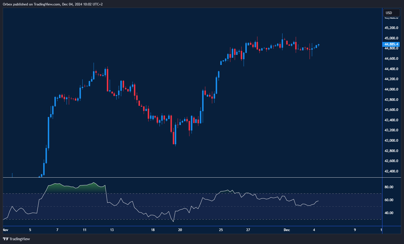 يشهد مؤشر داو جونز حالة من الاستقرار بينما يقترب من الوصول إلى مستوى قياسي جديد. أدى اختراق مستوى 44400 إلى انسحاب البائعين على المدى القصير، مما ساهم في استقرار المزاج العام للسوق بعد التصحيح الأخير. ورغم أن الانحراف السلبي لمؤشر القوة النسبية يشير إلى تباطؤ في الانتعاش، إلا أنه لم يكن كافياً لوقف زخم الارتفاع. قد يوفر التراجع الطفيف فرصة لتجمع المشترين ودفع الأسعار فوق مستوى 45000. في حين أن المستوى 44600 يمثل دعماً حاسماً في حال تراجعت الأسعار.