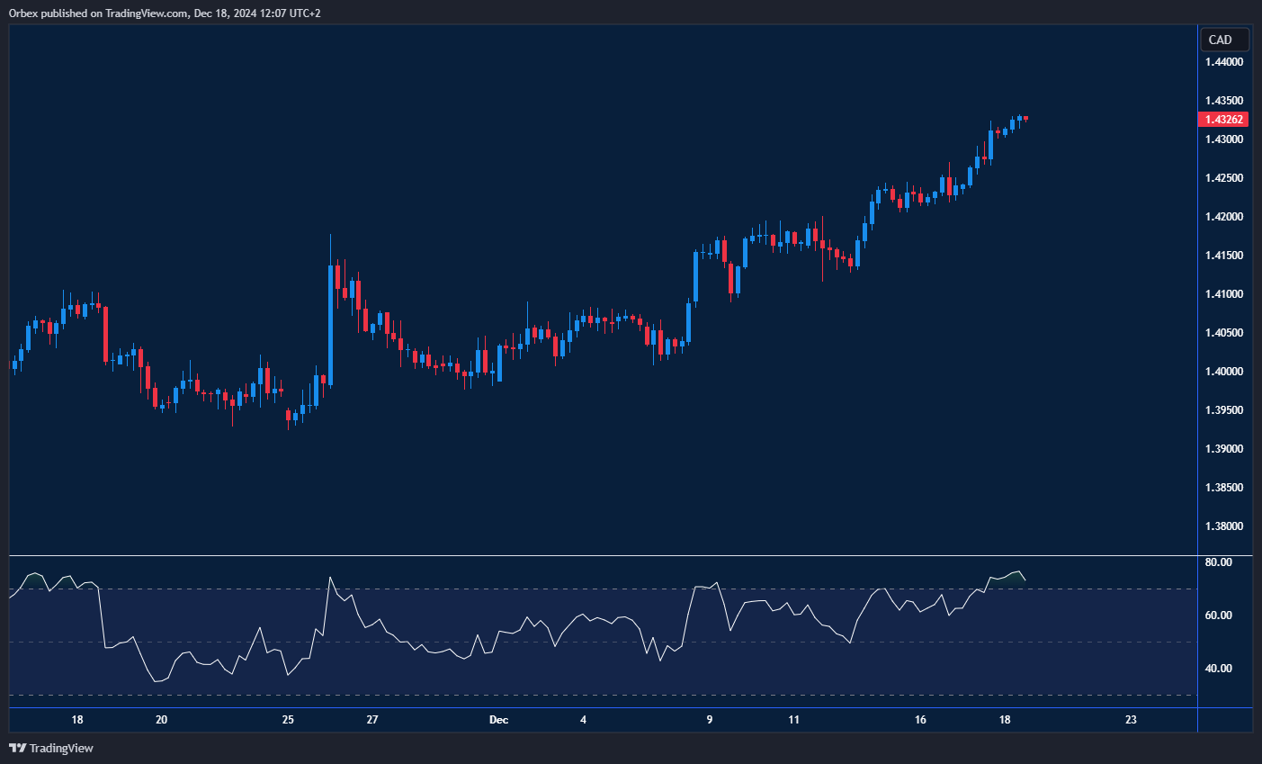 واصلت قيمة الدولار الكندي تراجعها أمام الدولار الأمريكي، مما أدى إلى بلوغ الزوج قمة جديدة. واصل السعر ارتفاعه بعد تجاوزه المستوى 1.4300، وهو مستوى لم يصل إليه منذ عدة أشهر، مما دفع مؤشر القوة النسبية إلى منطقة ذرة الشراء. قد يؤدي التباين السلبي إلى تصحيح إذا لم يتمكن المستوى 1.4350 من جذب دعم المشترين. يُعتبر مستوى 1.4270 هو الدعم الأقرب حاليًا، في حين أن كسر مستوى الدعم 1.4220 قد يغير المعنويات على المدى القصير.
