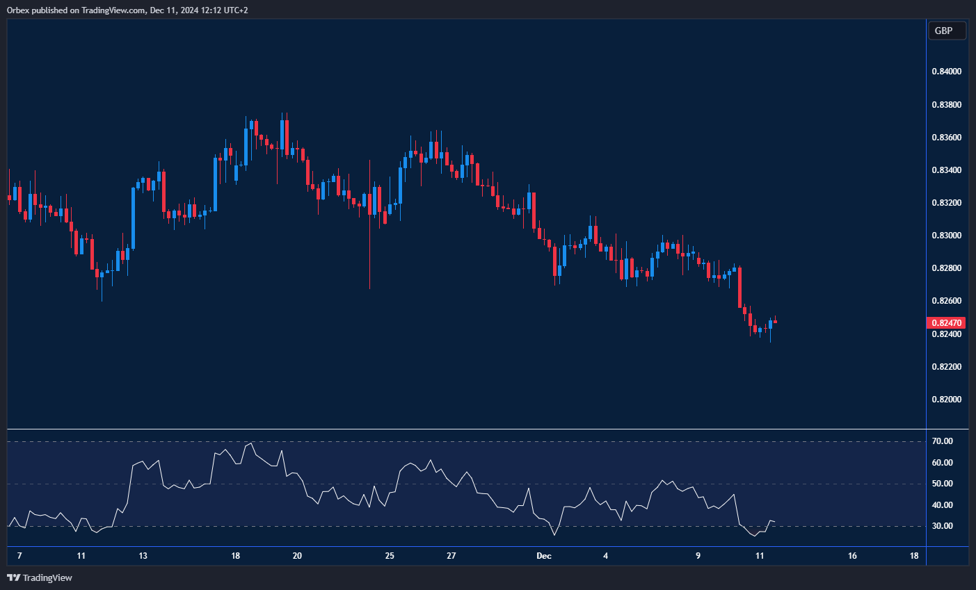 لا يزال زوج اليورو/الجنيه الإسترليني يواجه بعض الصعوبات، حيث يستمر الزوج في الانخفاض. تقترب الأسعار تدريجياً من مستوى الدعم اليومي عند 0.8230، الذي تشكل نتيجة لعمليات البيع المكثفة في نوفمبر. أي اختراق قوي قد يدفع البائعين إلى إغلاق مراكزهم، مما يفتح المجال أمام انتعاش يمتد نحو القمة السابقة عند 0.8360. على المدى القريب، أدت سلسلة القيعان المنخفضة إلى دفع مؤشر القوة النسبية نحو منطقة ذروة البيع، مما قد يستدعي ارتدادًا طفيفًا لإعادة تنظيم صفوف البائعين. يُعتبر مستوى 0.8200 نقطة مهمة للحفاظ على زخم الهبوط الحالي.