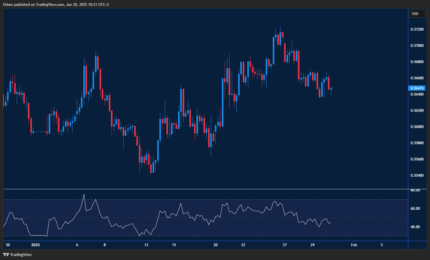 استمر الدولار النيوزيلندي في التراجع، حيث فقد أكثر من 100 نقطة، واستقر الزوج فوق مستوى الدعم الأخير عند 0.5630. يُظهر هذا التراجع المتقلب ضعف الزخم، مع توجه السعر نحو مستوى 0.5600، بينما يتحرك مؤشر القوة النسبية نحو المنطقة المحايدة. ومع ذلك، قد يتمكن المشترون من استعادة السيطرة في المدى القريب. إذ إن اختراق منطقة تكدس التداول عند مستوى 0.5660 قد يدفع الزوج نحو القمة اليومية الأخيرة عند 0.5720.