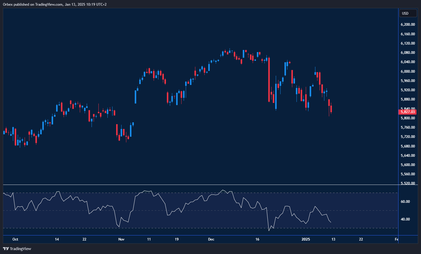 شهد مؤشر ستاندرد آند بورز تراجعًا ملحوظًا بعد كسره لمستوى دعم قوي آخر، مؤديًا إلى فقدان جميع مكاسب شهر ديسمبر. واستمر الاتجاه الهابط في اكتساب زخم إضافي بعد كسر المستوى الأخير عند 5880. يُعتبر مستوى 5720، الذي يمثل بداية ارتداد شهر نوفمبر، هو العقبة التالية قبل تأكيد التراجع الحاد للمؤشر. ومع دخول مؤشر القوة النسبية مرة أخرى إلى منطقة ذروة البيع، قد يكون هناك حاجة لارتداد لمنح التراجع الوقت الكافي لاستعادة زخمه. يُعتبر مستوى 5900 هو المقاومة الأولى في حال حدوث تغيير في معنويات السوق أو دخول مشترين جدد لدفع المؤشر نحو الارتفاع.