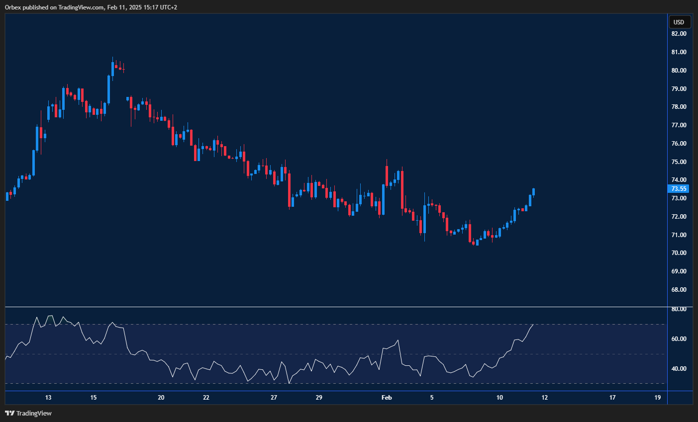 يواصل خام غرب تكساس الوسيط الصعود مع زيادة الطلب على النفط. ومع ذلك، فإن الإغلاق فوق القمة السابقة عند 73.00 قد يكون قصير الأجل إذا اصطدمت الأسعار بمقاومة قوية عند 74.00. أي تراجع دون 72.70 قد يدفع المستثمرين المراهنين على الارتفاع إلى الخروج من السوق. خاصةً إذا استمر مؤشر القوة النسبية في الاقتراب من منطقة التشبع الشرائي. في حال تمكن السعر من اختراق مستوى 74.00، فقد نشهد تجددًا في الطلب من المشترين، أما في حال الفشل، فقد تتجه الأسعار للبحث عن دعم عند القاع الأخير 70.80.