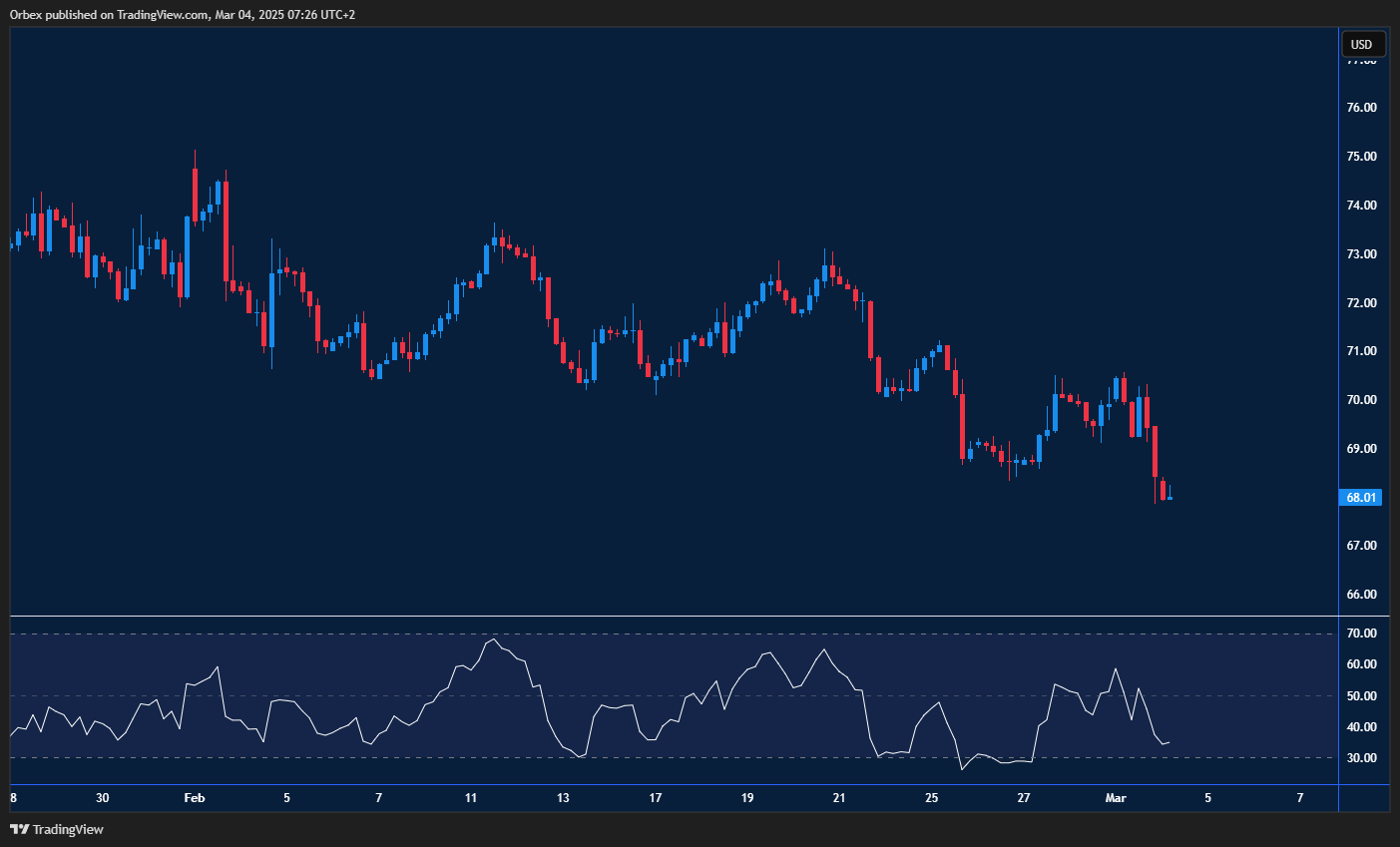 تراجع النفط الخام بعد إعلان أوبك عن اتفاق مبدئي لزيادة الإنتاج. وبينما شهد السعر ارتدادًا طفيفًا من مستوى 70.00، لا يزال الاتجاه العام سلبياً. يتطلب وقف المزيد من الانخفاضات على المدى الطويل ثبات مستوى 68.00. وإذا تمكن السعر من تجاوز 68.60، فقد يخفف ذلك من الضغوط الهبوطية على المدى القصير، مما يمنح المشترين بعض الثقة. أما المقاومة التالية فتتمركز عند 69.50، والتي تعتبر حاجزًا رئيسيًا يجب كسره لعكس اتجاه السوق.