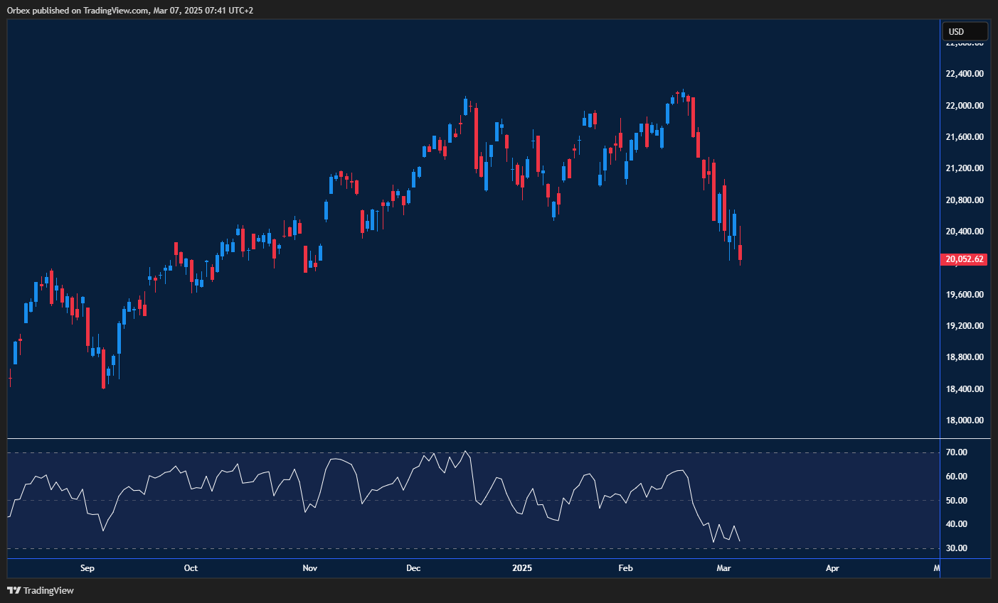 استأنفت الأسهم موجة التصحيح الحاد في بداية الأسبوع مع استمرار قلق المستثمرين، خاصة بعد فشل تعليقات البيت الأبيض الأخيرة بشأن السياسات الجمركية في تهدئة الأسواق. يدخل المؤشر في منطقة تصحيحية، كما هو الحال مع داو جونز وستاندرد آند بورز 500. وعلى الرغم من إعلان الرئيس عن تأجيل التعريفات لمدة شهر، فإن ذلك لم يمنع ناسداك من الاقتراب من منطقة 20000 نقطة. حيث يحاول السعر تجاوز 20500 لاستعادة بعض الزخم الإيجابي.