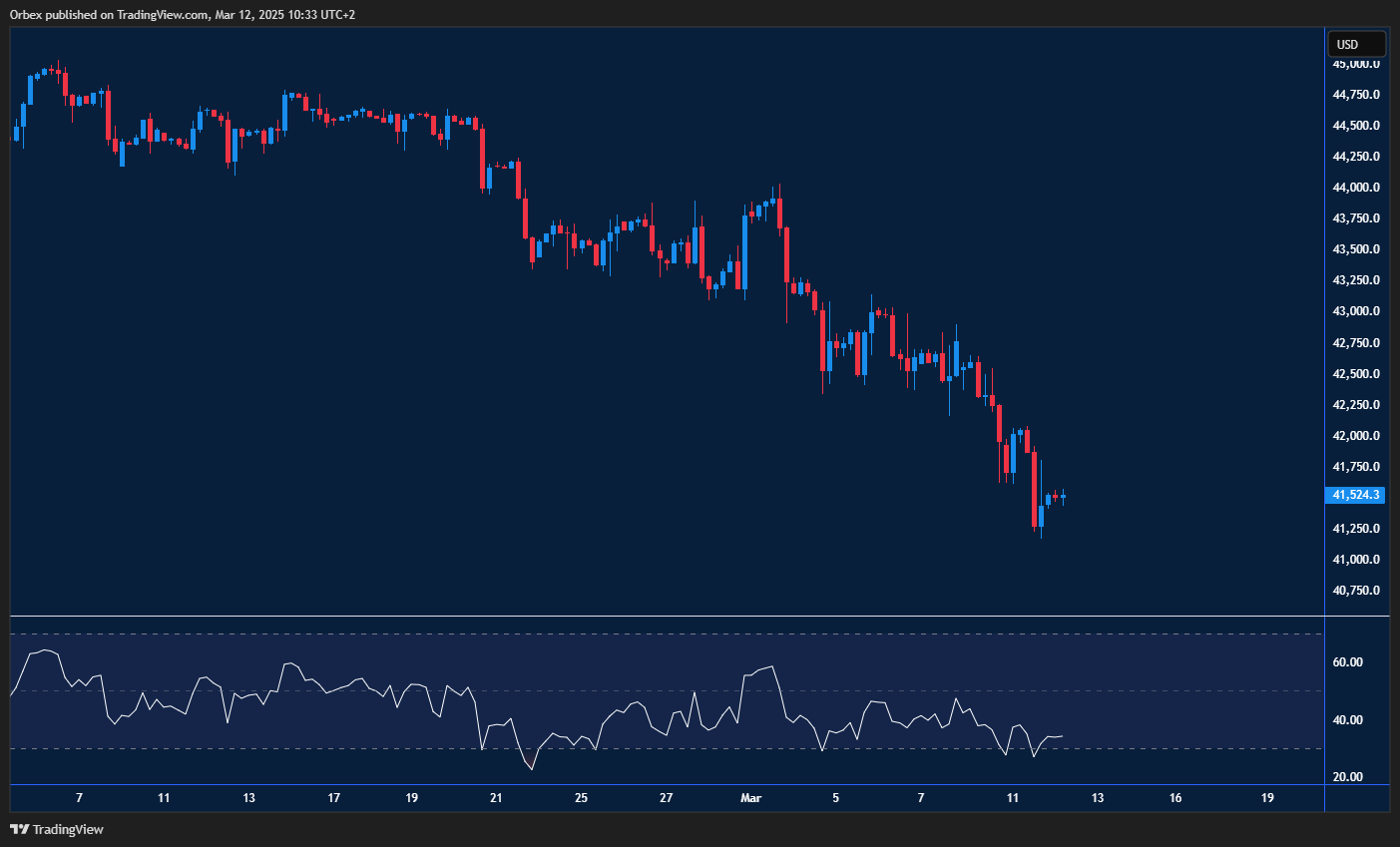 مؤشر داو جونز تحت الضغط بعد أن واصل تراجعه مع تصاعد الحرب التجارية التي يقودها دونالد ترامب. قد يشير الدعم عند مستوى 41200 إلى تغير محتمل في الاتجاه، حيث إن تجاوز القمة الأخيرة عند 41750 قد يفتح المجال لاختبار قمة جديدة قريبًا. في الأسابيع الماضية، كانت هناك خط اتجاه هابط يدعم الموجة البيعية، بينما يمثل مستوى 41000 حاجزًا رئيسيًا للحفاظ على الزخم الصعودي. في حال كسره، قد نشهد تراجعًا إلى ما دون 39600، ما لم يتدخل المشترون لدعم الأسعار.