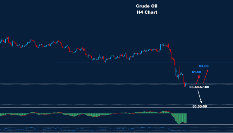 كما نرى على الرسم البياني، توجد منطقة دعم حول 56.40-57.00، مما قد يدفع السعر إلى تصحيح ارتدادي نحو 61.50 وما فوق.