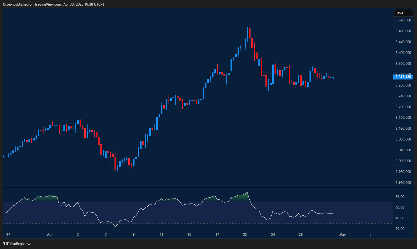 يواصل الذهب تحركه في نطاق جانبي ضيق في ظل ترقّب الأسواق لإشارات جديدة تتعلق بالحرب التجارية الجارية. وشهد الأسبوع الماضي عمليات بيع حادة أفقدت المعدن الأصفر أكثر من 200 دولار، لكن السعر حافظ على مستوى 3300. تجاوز مستوى 3400 مجددًا قد يُعيد الزخم الصعودي إلى السوق. في حال التعافي، سيكون 3330 هو أول مستوى مقاومة يجب مراقبته. أما على الجانب الهابط، فإن 3275 يشكّل أول مستوى دعم حرج.