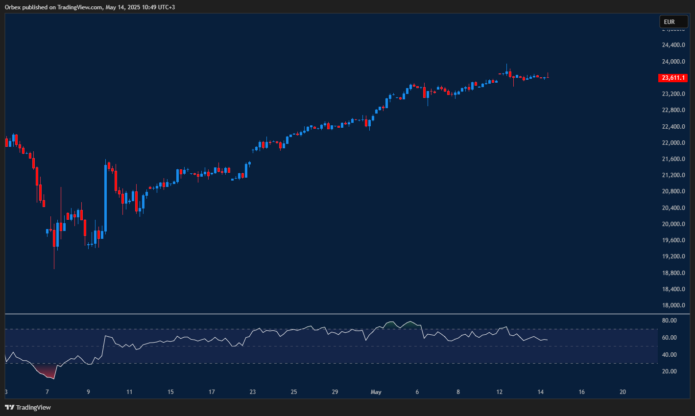 يحافظ مؤشر الداكس40 على زخمه الصعودي بدعم من اتفاقات تجارية إيجابية عززت أداء الأسواق العالمية. ورغم كسر طفيف دون مستوى 23000 دفع بعض المستثمرين إلى جني الأرباح، إلا أن ذلك لم يكن كافيًا لتغيير نبرة السوق الإيجابية. وقد سمح الارتداد اللاحق بوصول الأسعار إلى القمة الأخيرة عند 23800، مما دفع البائعين لتصفية مراكزهم ترقبًا لمواصلة الاتجاه الصاعد. ويُعد مستوى 24000 المقاومة التالية التي ينبغي تجاوزها لتحقيق قمة جديدة، بينما يشكل 23200 أول مستوى دعم على المدى القريب.