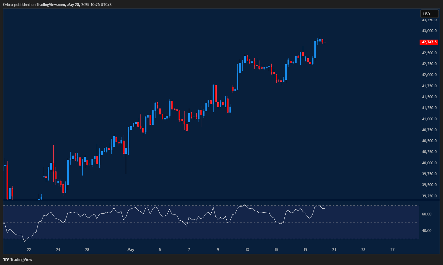 تجاهل مؤشر داو جونز خفض التصنيف الائتماني الأخير، وأنهى جلسة تداول أخرى على مكاسب. وقد أدى اختراق المستوى المرتفع الأخير عند 42500 إلى زيادة الضغط على البائعين، ومع وجود طبقات متعددة من الدعم في الأسفل، يُرجّح أن يواصل المؤشر صعوده نحو الهدف التالي عند 43000. ويُعد مستوى 42200 الذي يمثل قاعدة القاع الأخير مستوى الدعم الحالي في حال ظهور أي حركة تصحيحية، خاصة مع اقتراب مؤشر القوة النسبية من منطقة التشبع الشرائي.