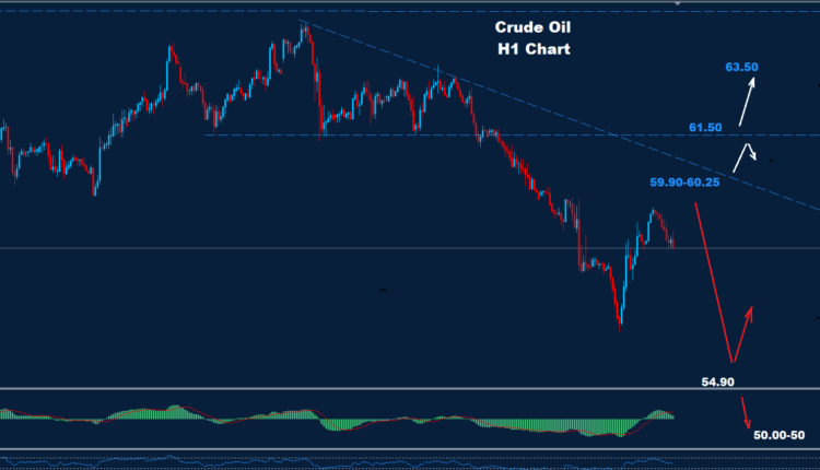 حقق النفط الخام ارتدادًا سريعًا يوم أمس. كما نرى على الرسم البياني اليومي، يواجه السوق ترند هابط حول منطقة 59.90-60.25، مما قد يُبقي ضغط الانخفاض قائمًا لمزيد من الانخفاض. فوق مستويات 60.25 قد يتجه السوق لمزيد من الارتفاع مع وجود مقاومات حول مستوى 61.50 و63.50.