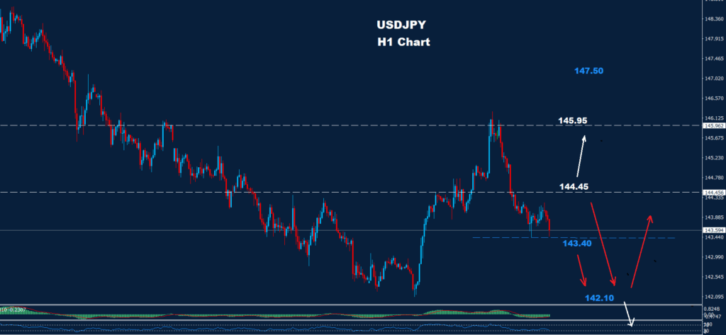 كما نرى في الرسم البياني، يواجه السوق دعمًا عند 142.10، وما دام السوق يحافظ على تداولاته فوق هذا المستوى، فقد يتأثر السوق بحركة تصحيح ارتداديه ، حيث تقع مستويات المقاومة عند 143.45 و144.45.