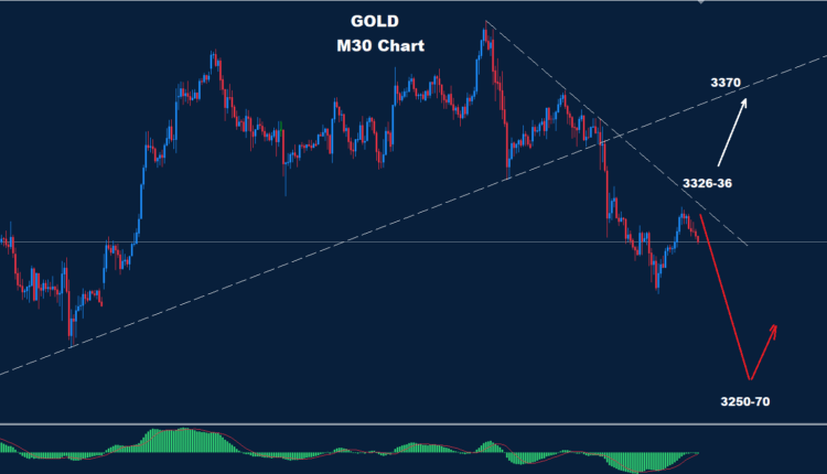 انخفض الذهب دون مستوى الدعم 3325 الأسبوع الماضي، مما قد يدفعه لمزيد من الانخفاض لاختبار منطقة الدعم 70-3250 كما أشرنا سابقًا.