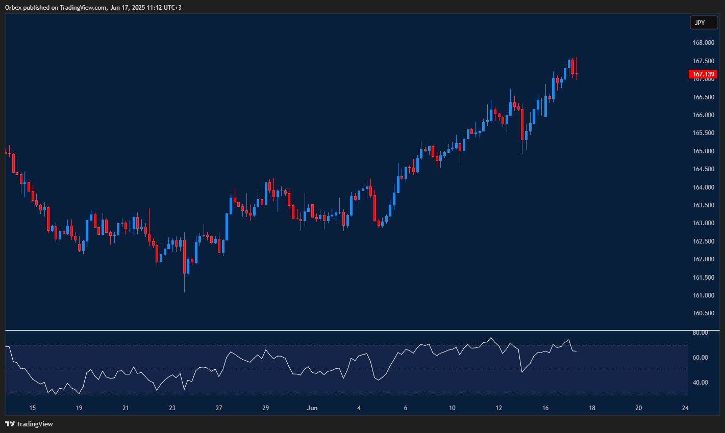 حافظ اليورو على سيطرته أمام الين الياباني على المشهد في ظل قرار بنك اليابان تثبيت سعر الفائدة عند 0.5%. وقد أدت حركة هبوطية طفيفة إلى مستوى 167.00 إلى إخراج بعض المتداولين المترددين، لكن المعنويات بقيت مستقرة نسبيًا. وتشير حركة السعر إلى استمرار الضغط الشرائي، حيث يشكل مستوى 167.60 المقاومة الأقرب، واختراقه يمهد الطريق نحو قمة جديدة عند 168.50، وهو أعلى مستوى منذ عدة سنوات. أما في حال تراجع اليورو، فإن مستوى 166.00 يمثل دعماً أساسياً للحفاظ على الاتجاه الصاعد.