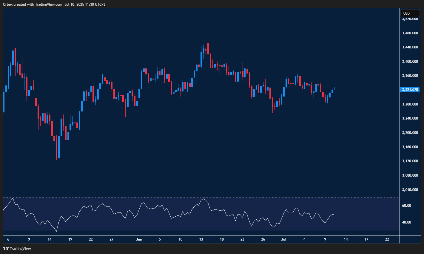 يواصل الذهب حركته المتذبذبة بعد أن تراجع إلى أدنى مستوياته في أسبوع. ويبدو أن بريقه كملاذ آمن قد خفت نسبيًا مع ارتفاع عوائد سندات الخزانة الأمريكية وجذب مؤشر الدولار للمزيد من المشترين. ومع ارتداد الأسعار من المستوى النفسي 3300، يصبح هذا المستوى دعمًا حاسمًا، حيث إن أي تصحيح أعمق قد يدفع الأسعار نحو 3270. وعلى الجانب الصاعد، يشكّل مستوى 3360 القمة السابقة الهدف الأول للمشترين.