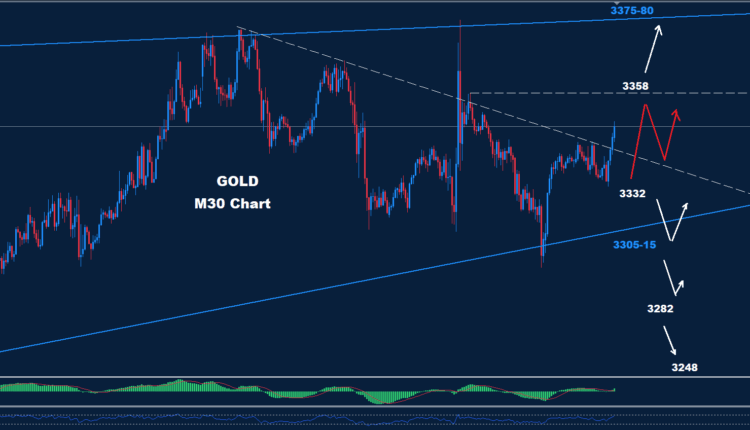 حقق الذهب اهداف 15-3305 يوم أمس، مما دفع باتجاه تصحيح ارتدادي كما توقعنا سابقًا. كما نرى على الرسم البياني اليومي، يواجه السوق دعمًا عند 3332، بينما يواجه مقاومة عند 3358، مما قد يحافظ على منطقة تداول محدودة. فوق 3358، من المتوقع ارتفاع السعر نحو 80-3375. دون 3332، قد يشهد السوق انخفاضًا إضافيًا لإعادة اختبار 15-3305.