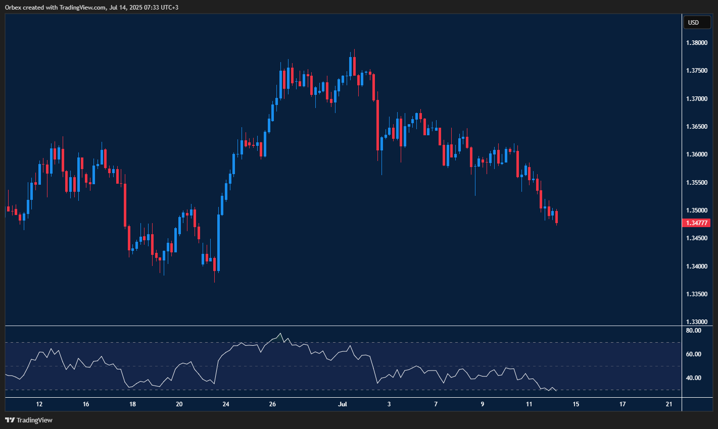 يُعاني زوج الجنيه الإسترليني مقابل الدولار من ضغوط قوية، حيث فقد أكثر من 300 نقطة منذ بداية الشهر، نتيجة قوة الدولار الأمريكي المتزايدة. حتى بيانات الناتج المحلي الإجمالي الإيجابية لم تكن كافية لمنع الجنيه من الانخفاض باتجاه مستوى 1.3400، والذي أصبح يشكل مستوى دعم حاسم. ومع دخول مؤشر القوة النسبية في منطقة التشبع البيعي، قد نشهد ارتدادًا محدودًا نحو الأعلى. وتُعد منطقة 1.3490 أولى العقبات التي ينبغي تجاوزها لاستئناف الصعود باتجاه القمة الأخيرة عند 1.3650. في المقابل، فإن استمرار التراجع سيؤكده كسر مستوى 1.3400 وفتح المجال لمزيد من الخسائر.