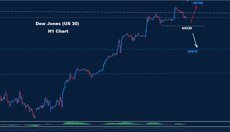قد يشهد السوق انخفاضًا إضافيًا دون مستوى 44330، بينما يقع مستوى الدعم عند 43670.