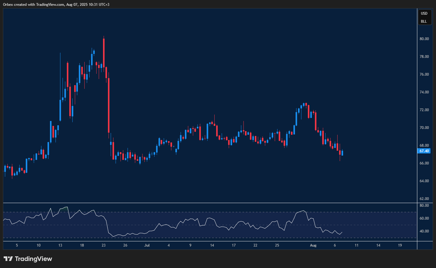 يستمر النفط الخام في مساره الهابط وسط ضغوط ناجمة عن مخاوف ضعف الطلب المستقبلي. ومع تصريحات “أوبك” حول تخمة المعروض، وتهديدات الرئيس الأمريكي دونالد ترامب للهند بشأن شراء النفط الروسي، تتواصل موجة البيع على “الذهب الأسود”. وقد تسهم بيانات إدارة معلومات الطاقة الأمريكية والمعهد الأمريكي للبترول هذا الأسبوع في الحد من التراجعات. إلا أن الاحتمال الأكبر أن السوق يتجه نحو موجة هبوط جديدة. ويستقر السعر حالياً فوق مستوى 67.00 دولار للبرميل بصعوبة، مع اعتبار مستوى 73.00 دولار أولى مناطق المقاومة.