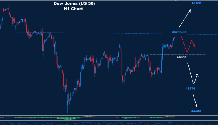 اختراق مستوى 44750 قد يمهّد الطريق لمزيد من الصعود، مع وجود مقاومات لاحقة عند 44870 و45100.
