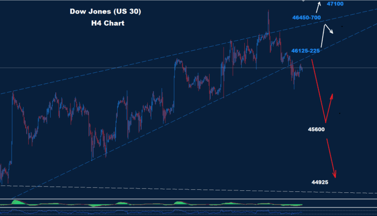 بدأ مؤشر داو جونز يُظهر بعض الضعف كما توقعنا سابقًا، انعكاسًا لنموذج الوتد الصاعد. كما نرى على الرسم البياني، يواجه السوق مقاومة عند مستوى 225-46125 ، وما دام السوق يتداول دون هذا المستوى، فمن المتوقع أن يشهد المزيد من الانخفاض نحو 45600 و44925. فوق مستوى 46225، قد يرتفع السوق أكثر لإعادة اختبار منطقة المقاومة عند 700-46450.