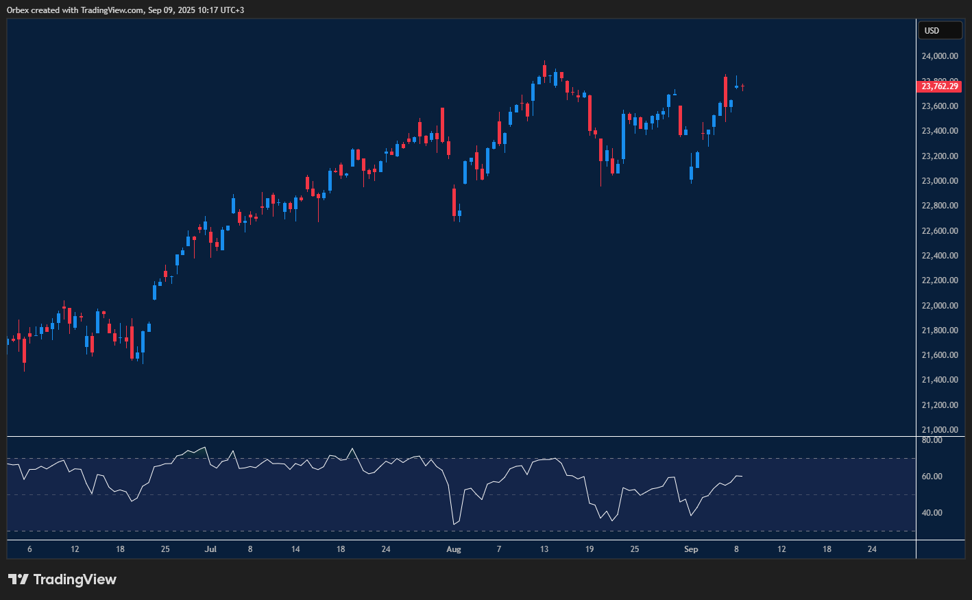 ارتفعت الأسهم بقيادة ناسداك الذي نجح في استعادة زخمه بعد الاختراق فوق حاجز 23500. تجاوز القمة الأخيرة عند 23750 سيعزز ثقة المتداولين المتبعين للاتجاه ويفتح المجال أمام موجة صعود جديدة. فيما يشكل المستوى النفسي 23000 دعماً يومياً رئيسياً لقياس قوة المشترين. أما 23900 فهو الهدف الجديد مع سعي السوق لمواصلة التقدم هذا الأسبوع.