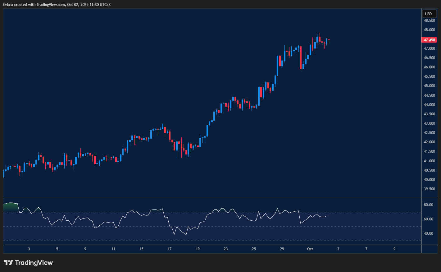 حافظت الفضة على زخمها الصعودي بعد تثبيت موقعها فوق 47.00. وقد دفع الصعود فوق 47.50 مزيداً من البائعين إلى تغطية مراكزهم، مما أثار تقلبات متزايدة في السوق. ويُعتبر مستوى 48.00 آخر معقل قوي للبائعين، وكسره قد يكشف عن قمة جديدة هي الأعلى منذ 14 عاماً، بما يقرب المعدن من مواصلة الصعود. وفي المقابل، قد يدفع وضع مؤشر القوة النسبية في منطقة التشبع الشرائي إلى تراجع محتمل، مع بقاء 46.00 أول مستويات الدعم المتوقعة.