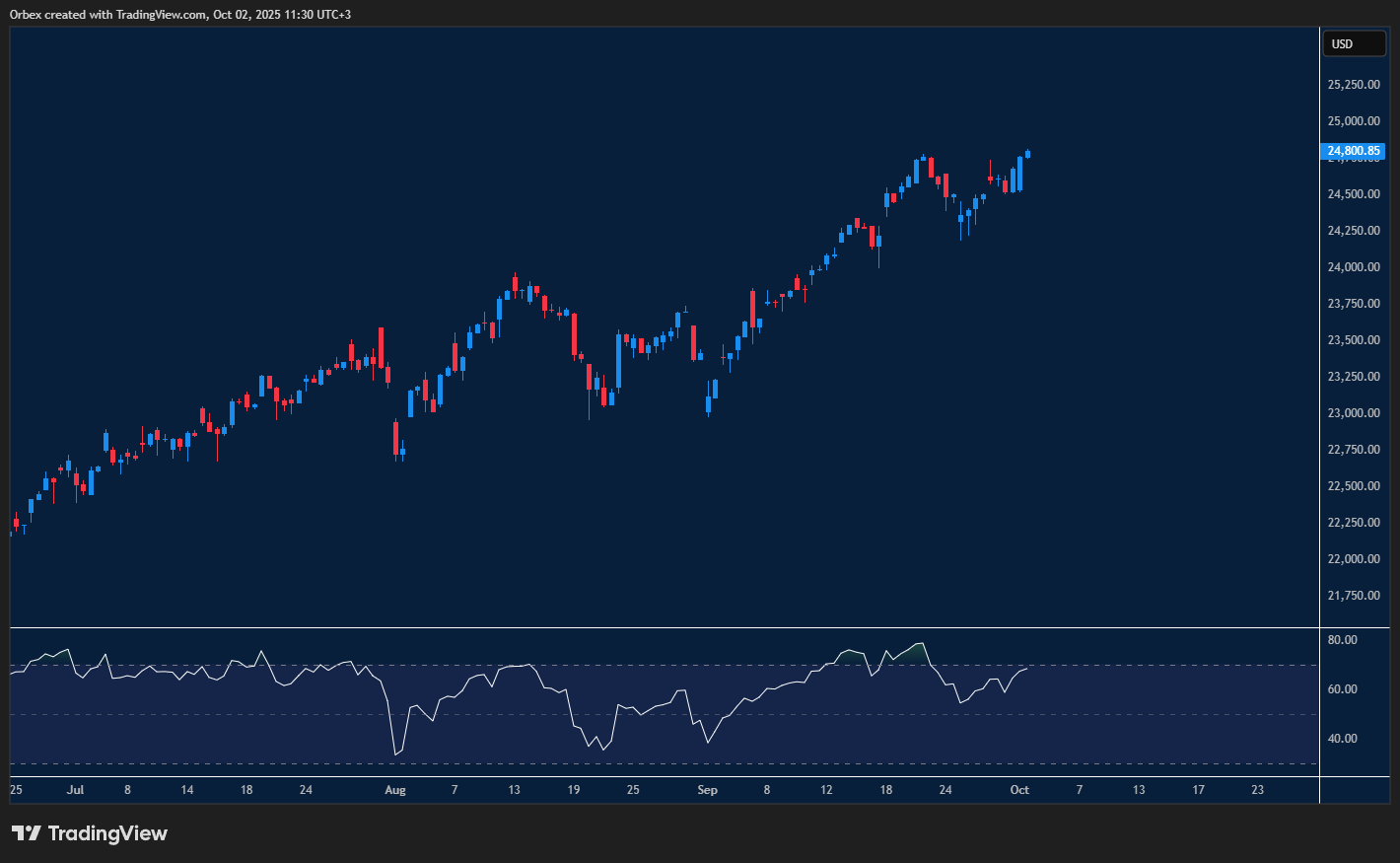 قفز المؤشر بدعم من ارتفاع أسهم التكنولوجيا والرعاية الصحية. وعلى الرسم البياني، يشير الاختراق فوق 24700 إلى أن المؤشر قد يكون في طريقه نحو رقم قياسي جديد. كما أن الارتفاع فوق القمة السابقة عند 24810 سيدفع مزيداً من البائعين إلى تغطية مراكزهم، مما يمهد الطريق لاستمرار محتمل نحو 28000. ومع ارتداد مؤشر القوة النسبية نحو منطقة التشبع الشرائي، يبرز مستوى 24250 كدعم جديد لاحتواء أي حركة تصحيحية.