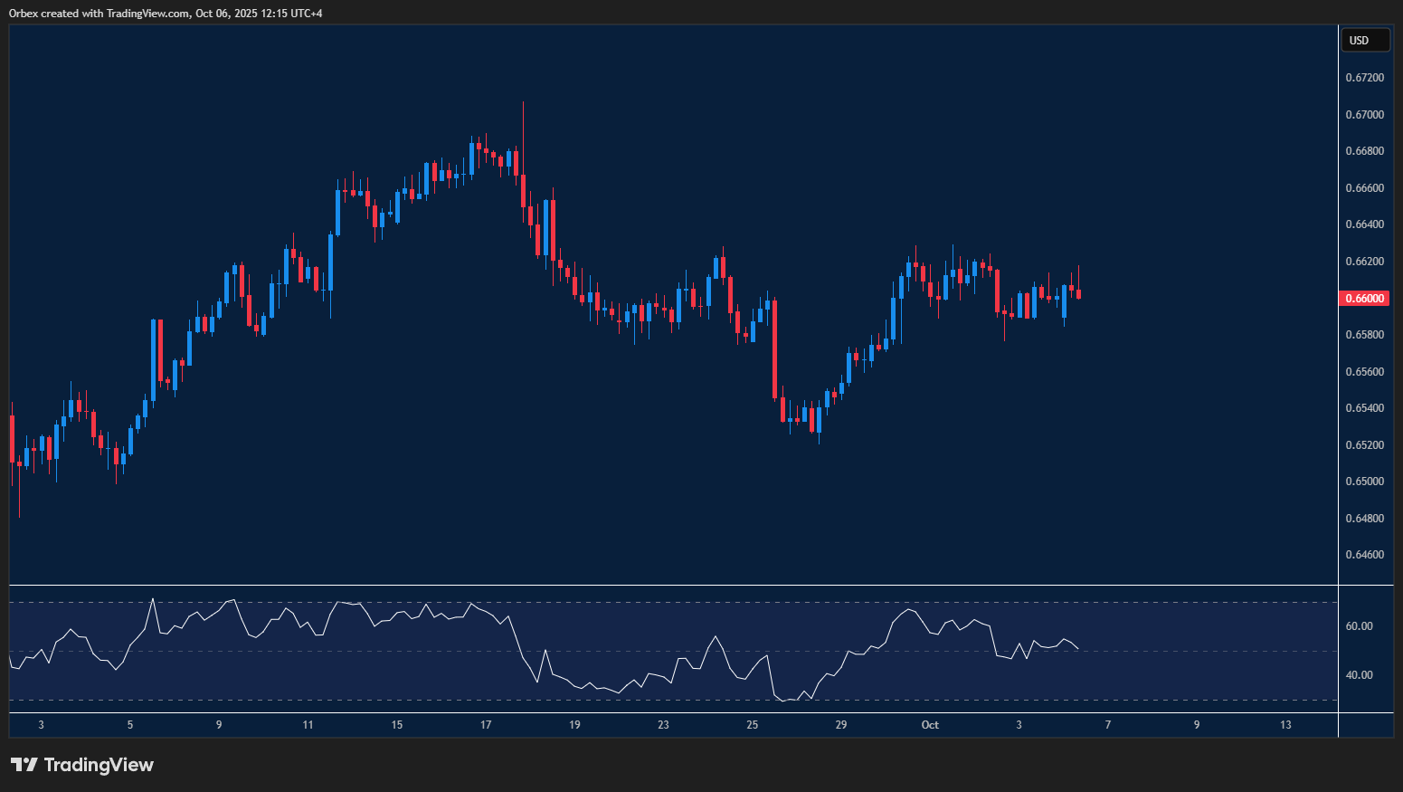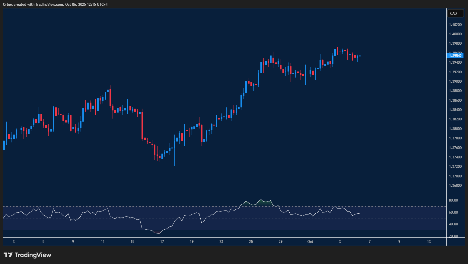 يظل الدولار الأمريكي قوياً في ظل توقعات المتداولين صدور بيانات قوية لاحقاً هذا الأسبوع بشأن توقف الحكومة. على الشارت، يختبر السعر منطقة 1.4000، وهي مقاومة رئيسية حتى الآن حالت دون استمرار ارتفاع العملة الأمريكية. وكسر هذه المنطقة سيشير إلى عودة التفاؤل لدى المشترين، مع اعتبار القمة الأخيرة عند 1.3980 هدفاً محتملاً. كما يظهر مؤشر القوة النسبية تراجعاً مؤقتاً، ما يجعل هذا الاختبار مؤشراً على مدى قدرة المشترين على الصمود، مع اعتبار مستوى 1.3940 أول مستوى دعم و1.3900 كطبقة دعم ثانية.