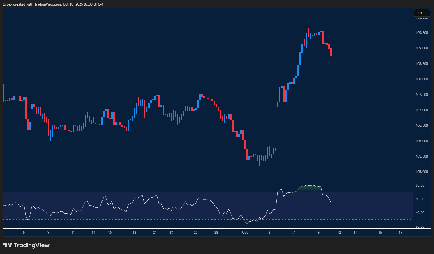 بدأ الين الياباني في استعادة بعض مكاسبه مع تلاشي موجة الضعف العامة عبر الأسواق. ويُظهر الرسم البياني أن المشترين لا يزالون يحاولون استعادة السيطرة بعد ارتداد بنحو 300 نقطة صعوداً من الفجوة السعرية التي شهدها السوق في عطلة الأسبوع الماضي. ورغم موجة البيع الأخيرة، يبدو أن السعر يحظى بدعم قوي فوق مستوى 108.00. وسيؤكد الإغلاق فوق 109.30 استمرار الزخم الصعودي وقد يدفع بالمزيد من البائعين إلى الخروج من السوق. في المقابل، فإن الهبوط دون 108.20 قد يفتح الطريق نحو 107.00 عند بداية الحركة الاختراقية السابقة.