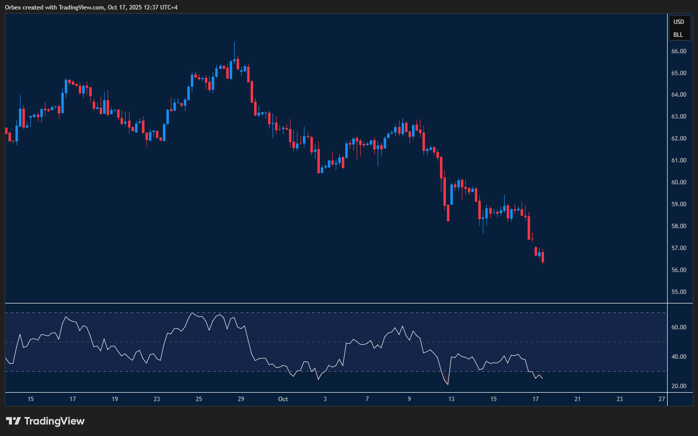 واصلت أسعار النفط تراجعها مع ضعف الطلب العالمي في الوقت الذي يمضي فيه الربع الأخير من العام. ورغم دخول مؤشر القوة النسبية في منطقة التشبع البيعي على الرسم البياني، فإن خام غرب تكساس الوسيط حافظ على الاتجاه الهابط بعد فترة وجيزة من التماسك قرب مستوى 59.00. وقد يؤدي مزيج من عمليات بيع جديدة وجني أرباح من المشترين السابقين إلى اختبار صمود القوى الشرائية. وفي حال استمرار الموجة البيعية، سيكون 55.00 مستوى الدعم التالي، بينما يُعد 57.80 مستوىً محورياً قد يعكس اتجاه الأسعار نحو الصعود مجدداً.