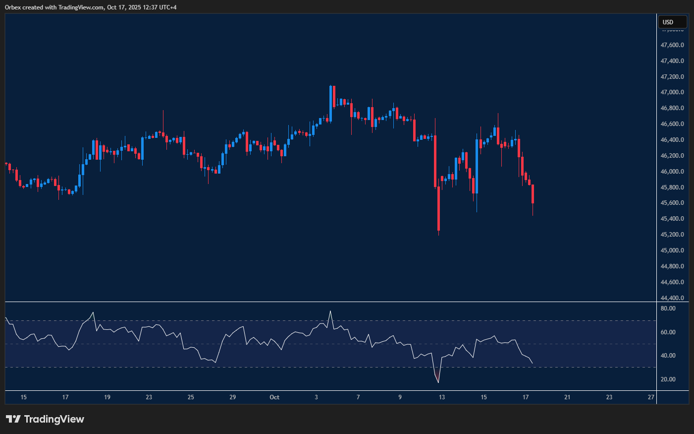 تراجع مؤشر داو جونز الصناعي بعد أن فشل في تسجيل قمة جديدة، متأثراً بموجة بيع جديدة. وأدى الهبوط دون مستوى 46000 إلى خروج بعض المتداولين من المراكز الشرائية، فيما لا يزال البائعون يحتفظون بسيطرتهم على السوق. ويُعد مستوى 45300 وهو القاع الأخير دعماً رئيسياً، وكسره قد يدفع المؤشر إلى موجة هبوطية نحو 44400. أما من ناحية المقاومة، فيُعد 45800 أقرب هدف صعودي، في حين يشكّل 46600 وهي المقاومة اليومية مستوىً حرجاً لعودة المؤشر إلى المسار الصاعد.