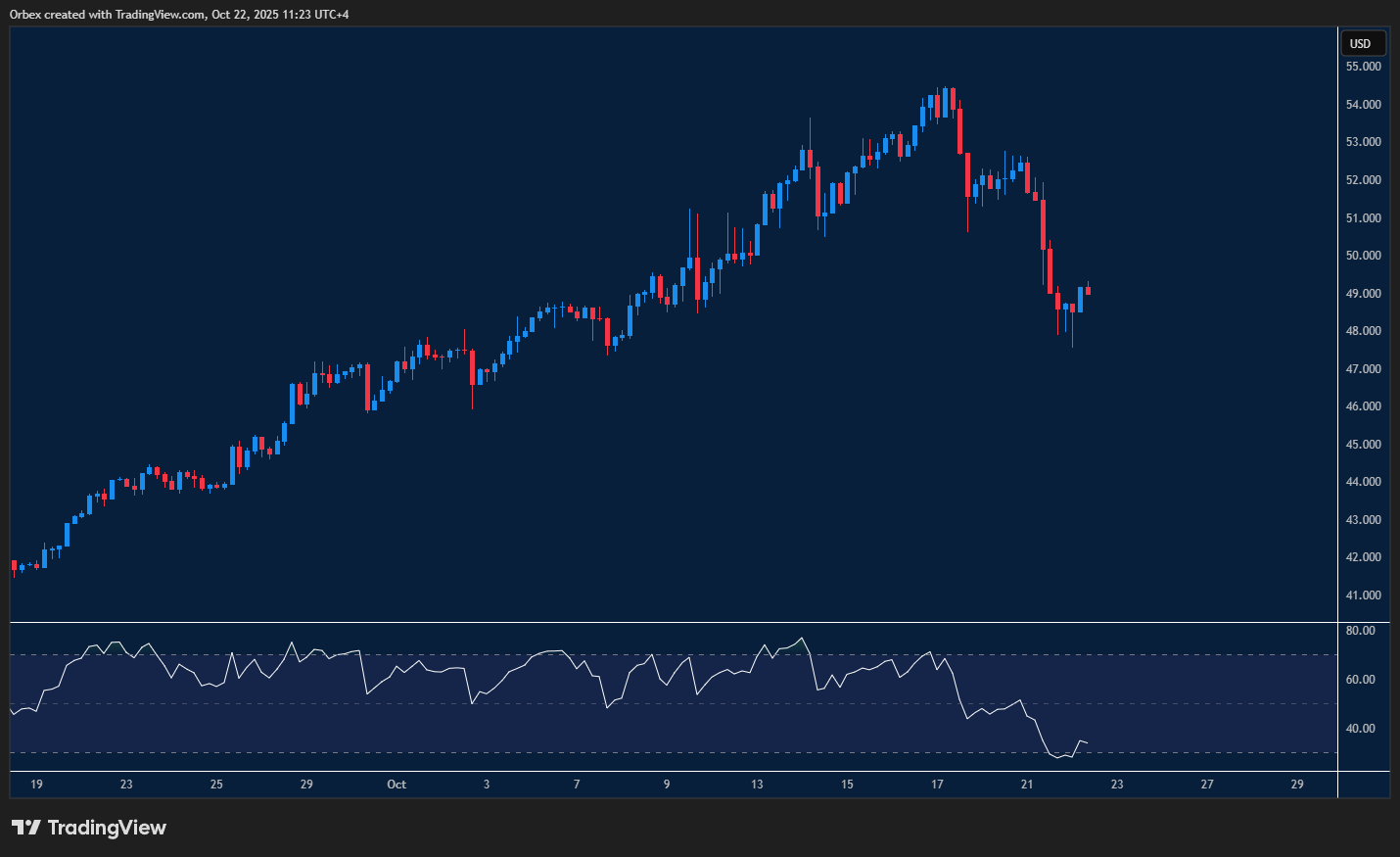 تحرّكت أسعار الفضة بعيداً عن قمّتها الأخيرة مع عودة البائعين إلى الساحة استعداداً لجولة تصحيح جديدة. ويُظهر الرسم البياني أن السعر يتحرك فوق القاع المزدوج اليومي عند 48.00، وهو مستوى دعم محوري يحافظ على تماسك المعدن الثمين. كما أنّ أي ارتداد فوق 49.60 من شأنه أن يخفّف من الضغوط البيعية بإخراج مراكز البيع قصيرة الأجل من السوق. المرحلة المقبلة ستكون حاسمة في تحديد مسار التعافي المحتمل، حيث يمثّل مستوى 48.50 أول دعم فني للحفاظ على الزخم، مع ملاحظة تراجع مؤشر القوة النسبية تدريجياً.