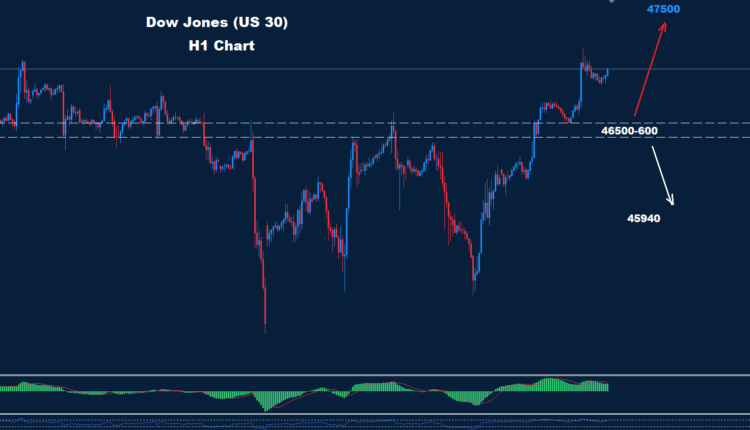 تمكن مؤشر داو جونز من تسجيل نقاط قليلة فوق مستوى المقاومة 47100، مما قد يؤدي إلى مزيد من الارتفاع كما توقعنا سابقًا. كما نرى على الرسم البياني اليومي، يواجه السوق دعمًا حول منطقة 600-46500 ، وطالما حافظ السوق على تداولاته فوقها، فمن المتوقع أن يرتفع نحو 47500 و47800. أما إذا انخفض المؤشر دون مستوى 46500، فمن المتوقع أن يستمر الانخفاض مع وجود دعم عند 45940.