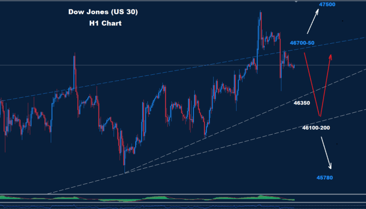 انخفض مؤشر داو جونز دون مستوى الدعم 46650، مما قد يُشكّل ضغطًا هبوطيًا على المدى اليومي.