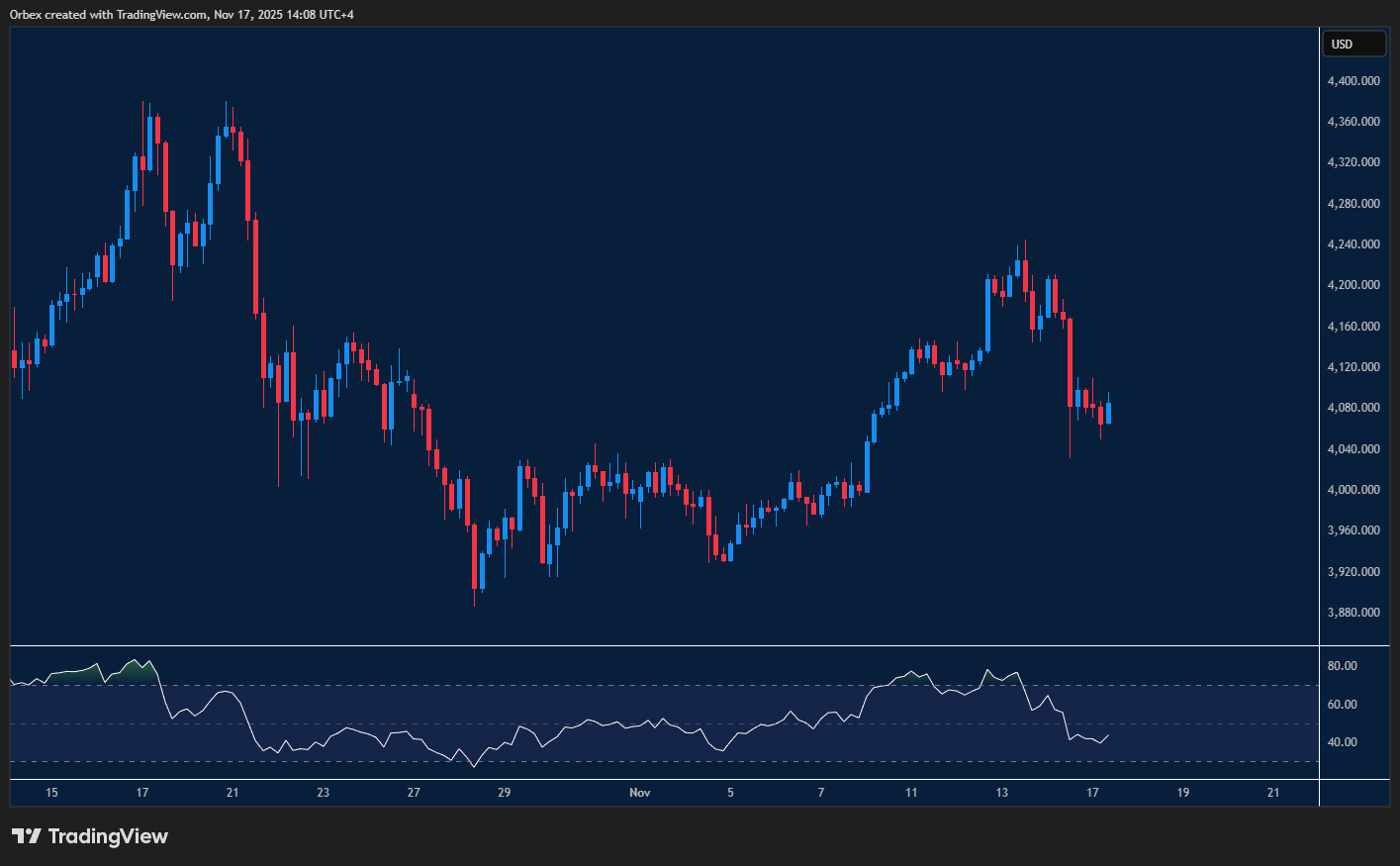 حافظ الذهب على وجوده فوق المستوى النفسي المهم عند 4000، وتلقى دعمًا ملحوظًا عند 4050 بعد الضغوط البيعية الأخيرة، في ظل ظهور انحراف صاعد على مؤشر القوة النسبية، ما يشير إلى بقاء القوى الشرائية داخل المشهد. ويُعد مستوى 4100 مقاومة أساسية ينبغي تجاوزها لتعطيل الاتجاه الهابط وبناء أرضية قوية لمرحلة تعافٍ مستمرة، بينما يظل مستوى 4040 خط الدفاع الأهم في حال حدوث تراجع.