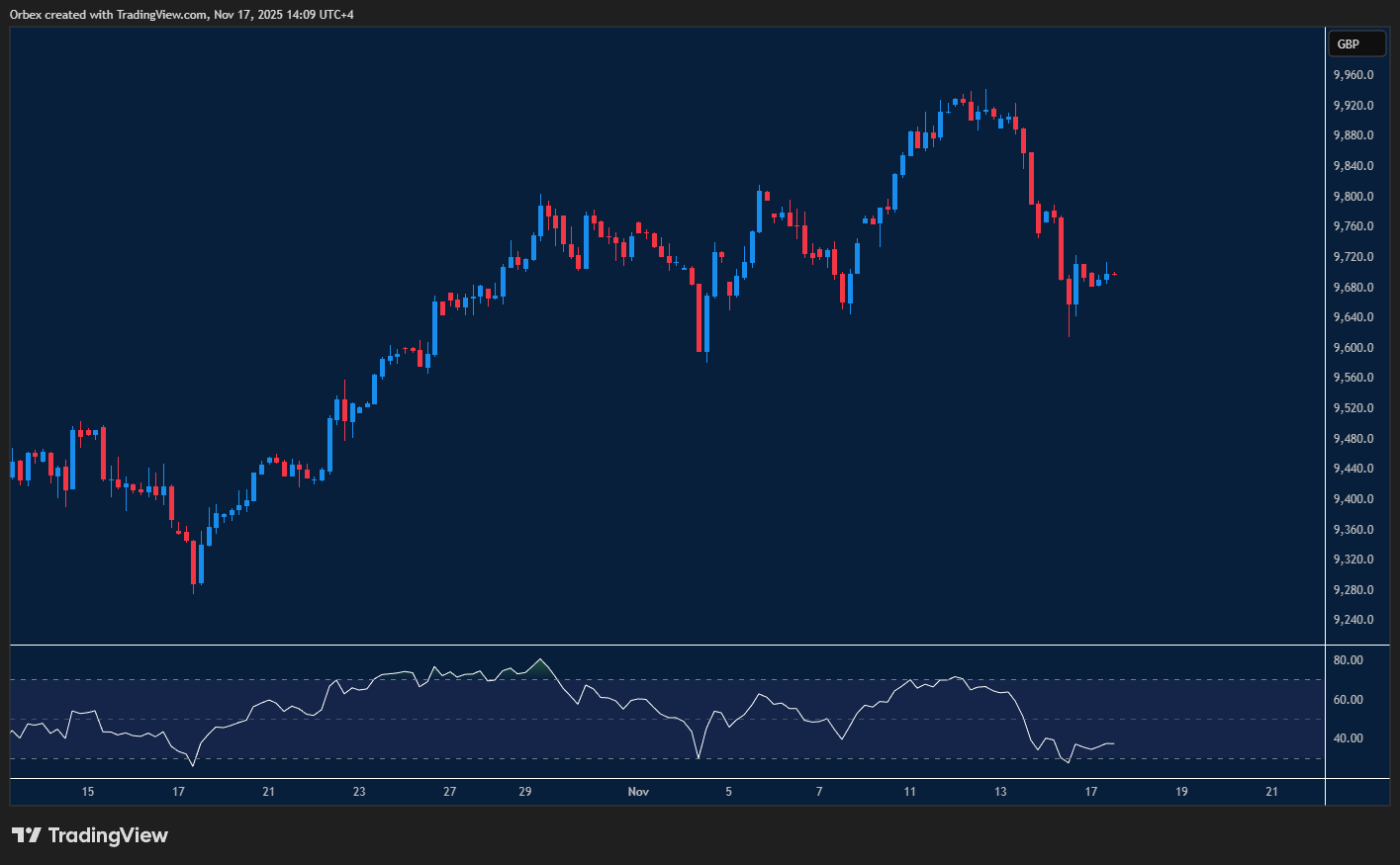يختبر مؤشر فوتسي مستوى دعم قويًا للحدّ من أي ضغوط بيعية إضافية. وبعد هبوطٍ بمئات النقاط، فإن أي كسر هابط إضافي سيزيد العبء على ما تبقى من المشترين. ويُعد الهبوط دون 9600 إشارة محتملة على امتداد المسار الهابط نحو 9520. في المقابل، قد تؤدي حالة التشبع البيعي على مؤشر القوة النسبية إلى ارتداد نحو 9760. خصوصًا إذا بدأ البائعون خلال التداولات اليومية بجني الأرباح.