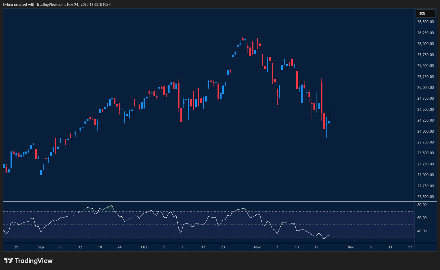 واصل مؤشر ناسداك هبوطه وسط موجة بيع واسعة طالت أسهم التكنولوجيا. ويحاول المؤشر الآن الحفاظ على وجوده فوق 24000، بعد أن خسر أكثر من ألف نقطة خلال عدة جلسات قصيرة. ويمثل مستوى 23800 قاعدة الحركة الأخيرة، وهو مستوى حرج ينبغي أن يصمد إذا كان هناك أي أمل في ارتداد فعلي. فثبات السعر فوقه قد يجذب عمليات شراء قائمة على الزخم ويدفع المؤشر باتجاه 24500. لكن الهبوط دون 23800 سيضعف المعنويات بشكل واضح. وقد يدفع المؤشر إلى مستويات أدنى، في وقت يتساءل فيه بعض المتعاملين عمّا إذا كانت فقاعة التكنولوجيا تقترب من الانفجار.