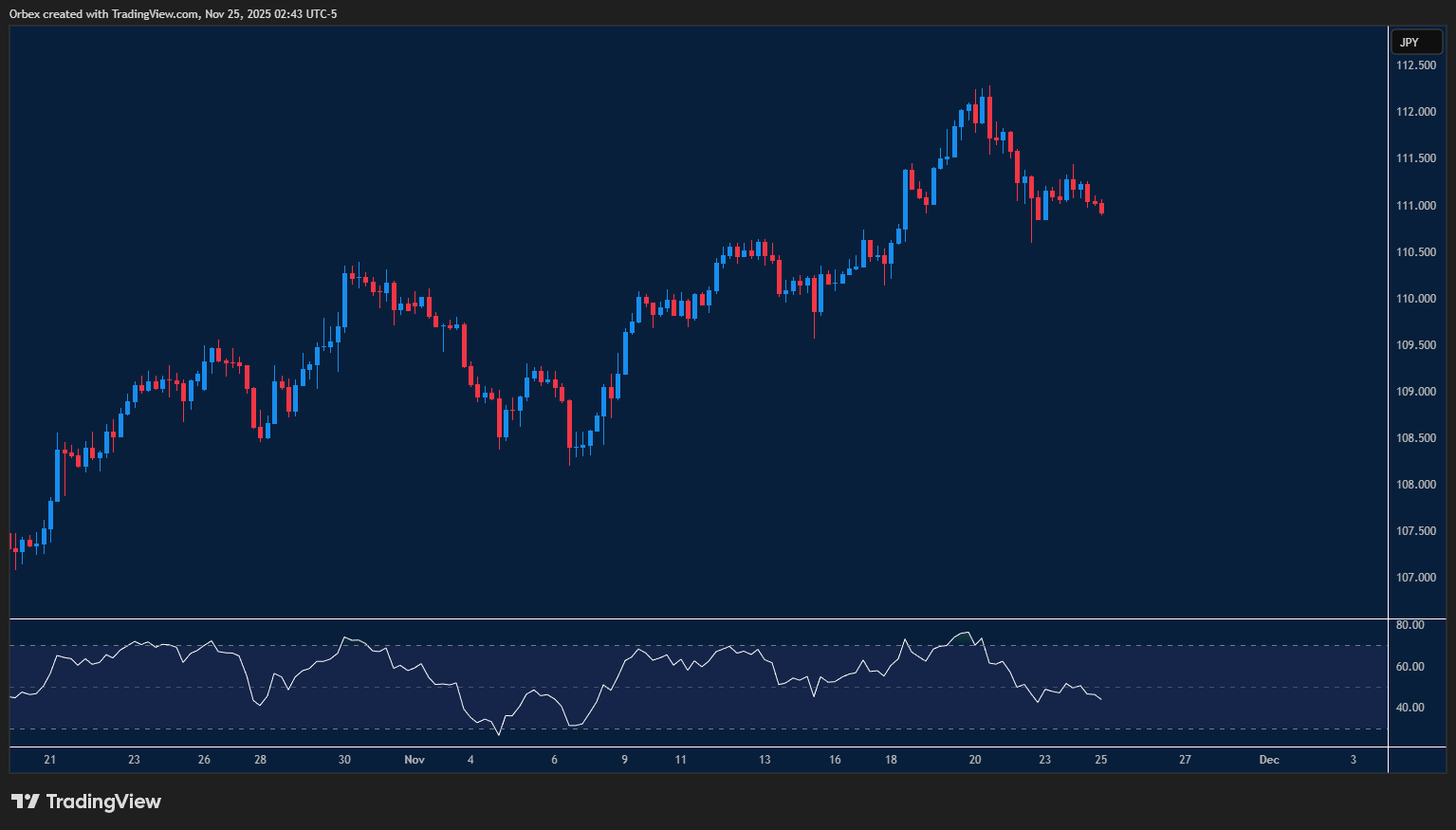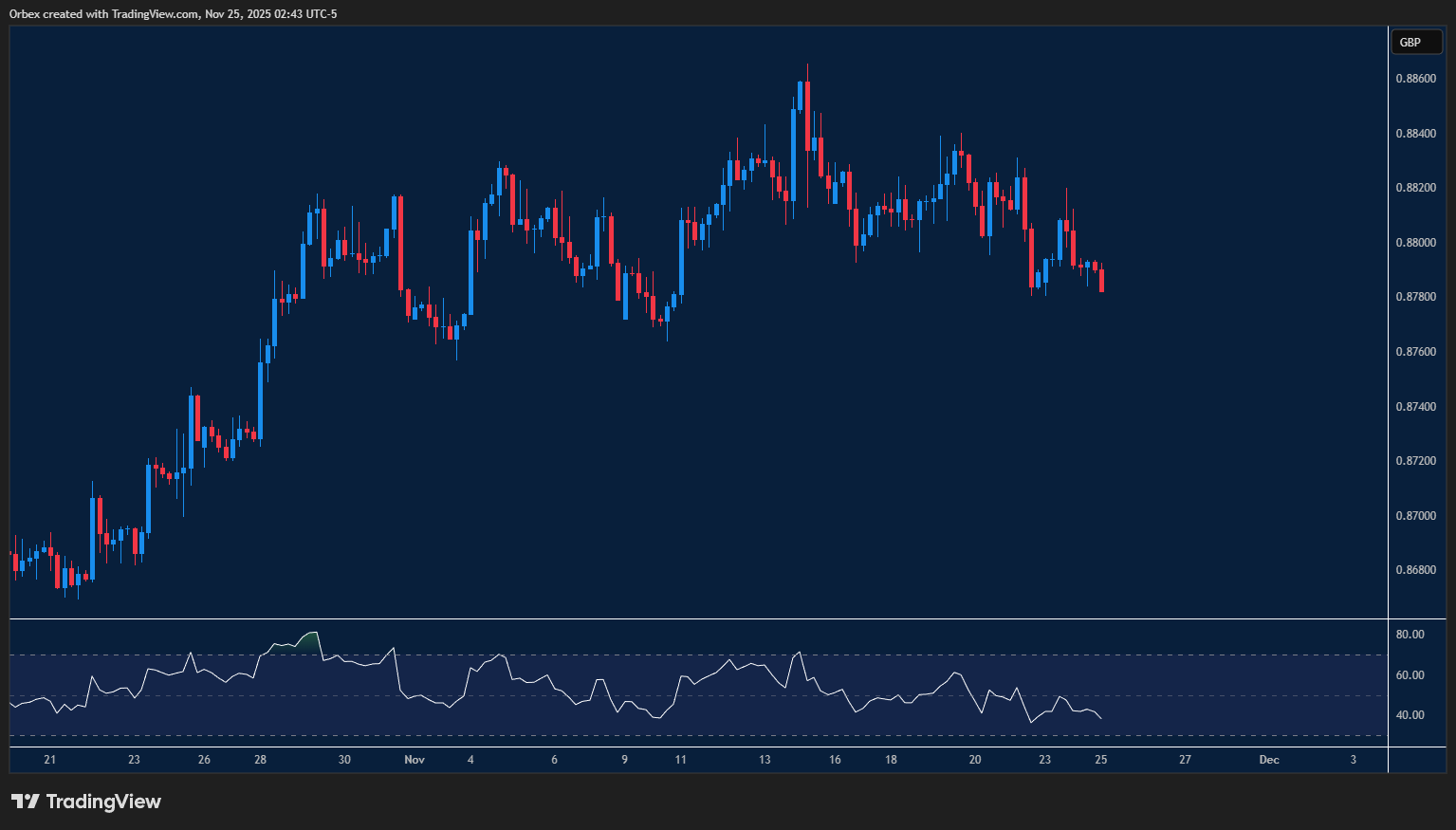 تراجع اليورو تدريجيًا بعد ابتعاده عن القمة الأسبوعية السابقة. والكسر الواضح لمستوى الدعم اليومي عند 0.8800 يشير إلى أن البائعين يستهدفون تمديد الحركة الهابطة. ويبرز مستوى 0.8760 كهدف مباشر، في حين يمثّل مستوى 0.8680 الذي انطلقت منه موجة الصعود في أكتوبر الهدف التالي، واختراقه قد يمهّد لاستمرار المسار الهابط. ومع دخول مؤشر القوة النسبية منطقة التشبع البيعي، يكتسب مستوى 0.8780 أهمية إضافية بوصفه دعمًا رئيسيًا في المدى القريب.