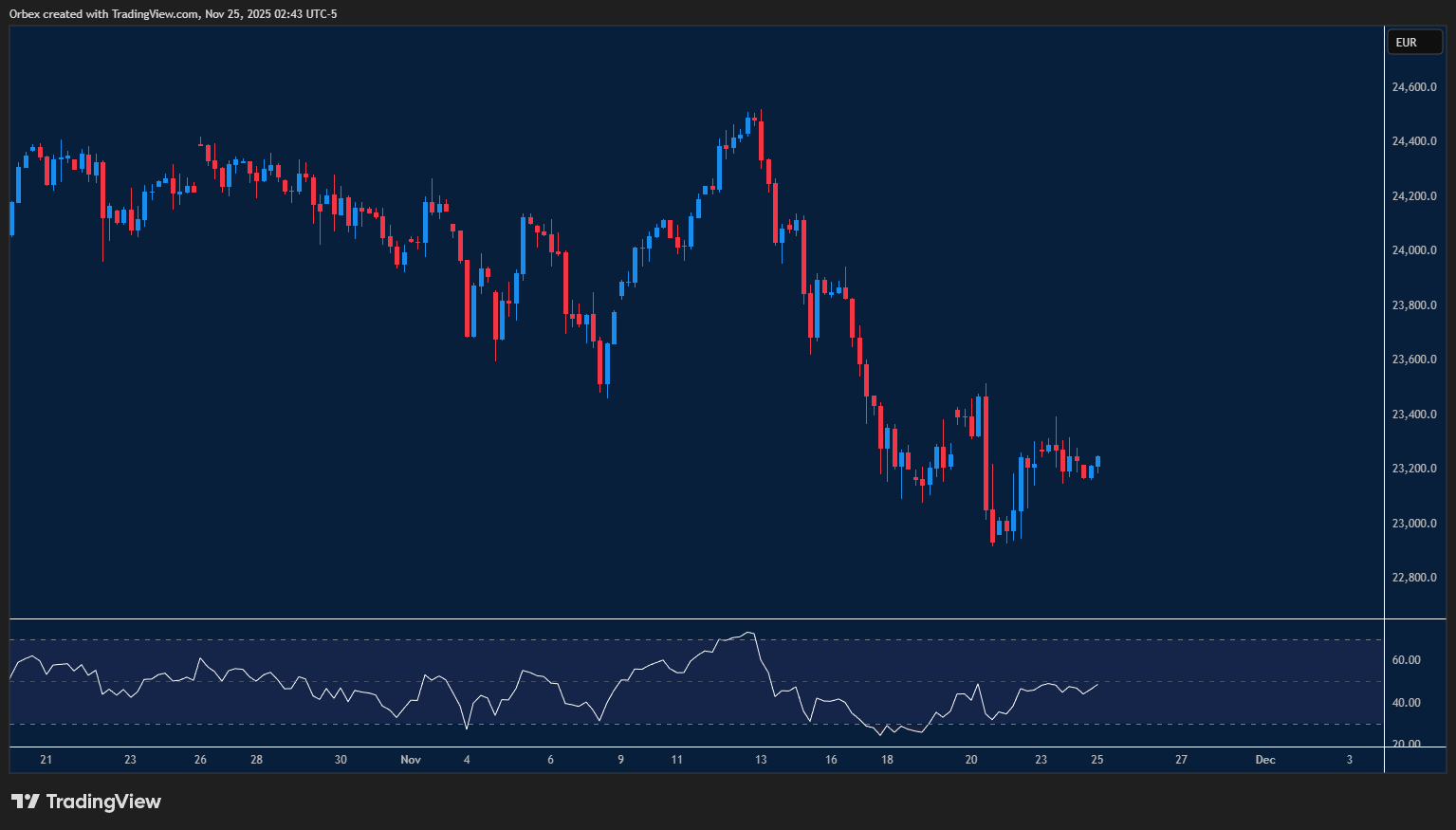 يحاول مؤشر داكس إيقاف موجة الهبوط التي سيطرت على معظم تداولات الشهر. فالهبوط دون قاعدة الارتداد الحالية عند 23000 سيُظهر أن زمام المبادرة لا يزال بيد البائعين، ما قد يدفع المشترين إلى الخروج من السوق. وإذا تحوّل المزاج العام إلى السلبية مجددًا، فقد يتزايد الضغط الهابط، ليصبح مستوى 22700 المحطة التالية لمراقبة أي انهيار محتمل. أما في الاتجاه المقابل، فيُعد مستوى 23400 أول عقبة ينبغي تجاوزها لتخفيف الضغط وإتاحة فرصة لتماسك الأسعار.