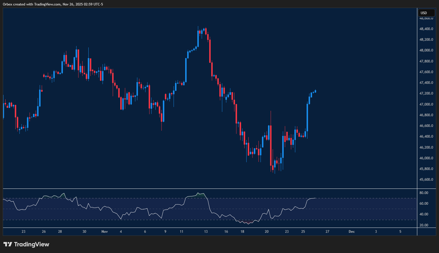 نجح مؤشر الداو في تسجيل ارتداد قوي بعد اختراقه مستوى 47,000، مستعيدًا جزءًا مهمًا من خسائره الأخيرة. ودخول مؤشر القوة النسبية في منطقة التشبّع الشرائي يعكس قوة الشراء الحالية، فيما تتحول قمة نطاق التذبذب الأخير إلى مستوى جوهري يدعم الإبقاء على النظرة الصعودية إذا جرى تجاوزه. أمّا إذا ظهرت إشارات ضعف، فقد نشهد عودة لاختبار مستوى 46,800 قبل استئناف أي محاولة صعودية جديدة.