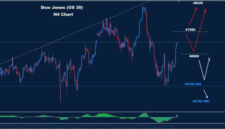 نجح مؤشر داو جونز في تجاوز مستوى المقاومة 46850، بينما يقترب من الهدف 47350.
