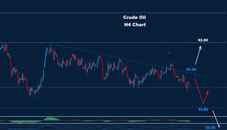 تمكن النفط الخام من الوصول إلى اهداف 80-57.60 ، مع استمرار انخفاضه. كما هو موضح في الرسم البياني، لا يزال السوق يتداول دون مستوى مقاومة الترند الهابط عند 59.00، مما قد يُبقي على ضغط الهبوط، بينما قد يدفع مستوى الدعم عند 54.80 السوق نحو تصحيح ارتدادي. من المتوقع مزيد من الارتفاع فوق 59.00، حيث تقع مستويات المقاومة عند 30-60.10 و62.60.