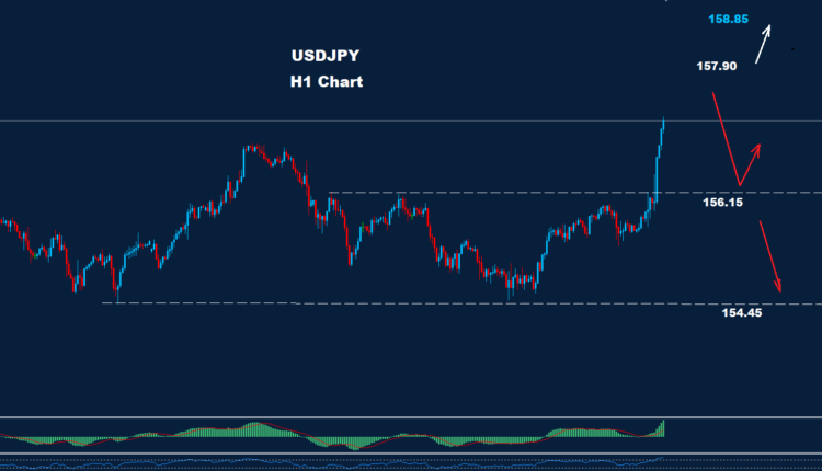 يواجه السوق مقاومة حول مستوى 157.90، مما قد يدفع السوق نحو تصحيح هبوطي باتجاه 156.15 قبل ارتداده.