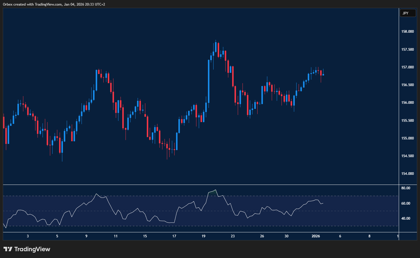 يواصل الين الياباني تراجعه أمام الدولار الأمريكي، في وقت تترقب فيه الأسواق صدور مجموعة من البيانات الاقتصادية المهمة من الولايات المتحدة خلال هذا الأسبوع. هذا الترقب أعاد الزخم إلى الدولار، ودفع الزوج للارتفاع بأكثر من 100 نقطة، في تعافٍ واضح أعقب موجة بيع قوية مع نهاية العام. حاليًا، يتحرك السعر بالقرب من مستوى 157.00، وهو مستوى محوري، إذ إن اختراقه بشكل واضح قد يفتح المجال للوصول إلى قمة ديسمبر عند 157.70. في المقابل، تبقى منطقة 156.50 أول خط دفاع في حال عادت الضغوط البيعية للظهور.