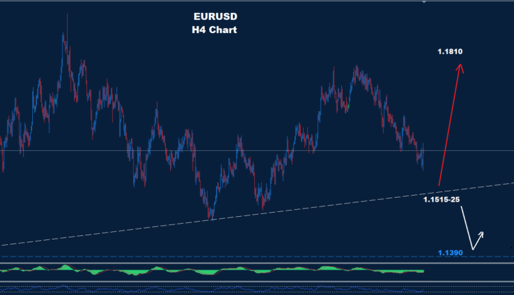 من المتوقع مزيد من الانخفاض دون مستوى 1.1515، بينما قد يتيح مستوى الدعم الثاني 1.1390 فرصةً لتصحيح ارتدادي.